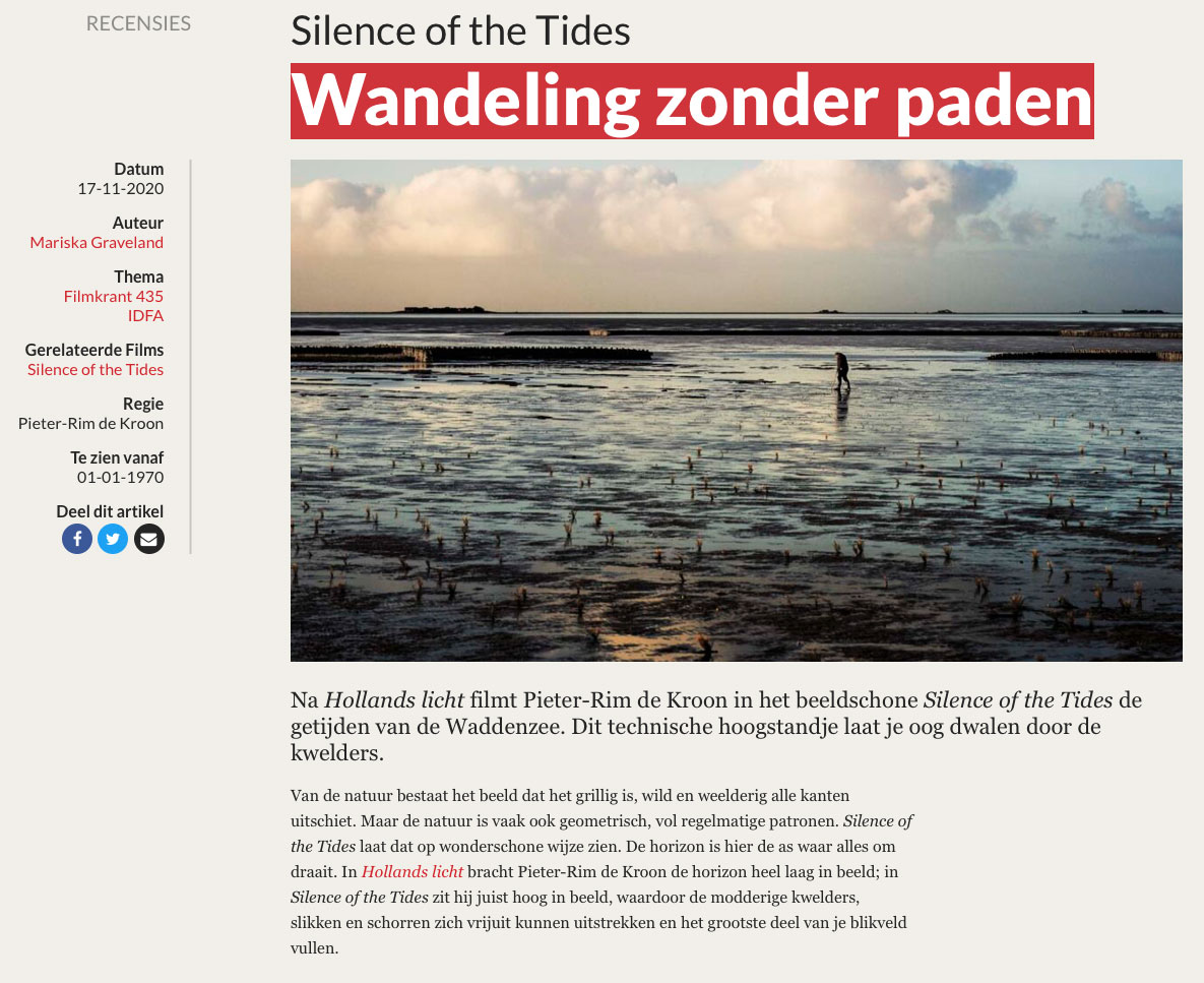 Het IDFA-programma waaiert dit jaar vanuit Amsterdam heel Nederland over. Als bij u in de buurt de documentaire Silence of the Tides van regisseur Pieter-Rim de Kroon te zien is, en u bent liefhebber van de Wadden, of u bent iets anders, dan zou ik er maar heengaan, want het is een bijna twee uur durend, oogverblindend eerbetoon aan het grootste intergetijdengebied ter wereld.