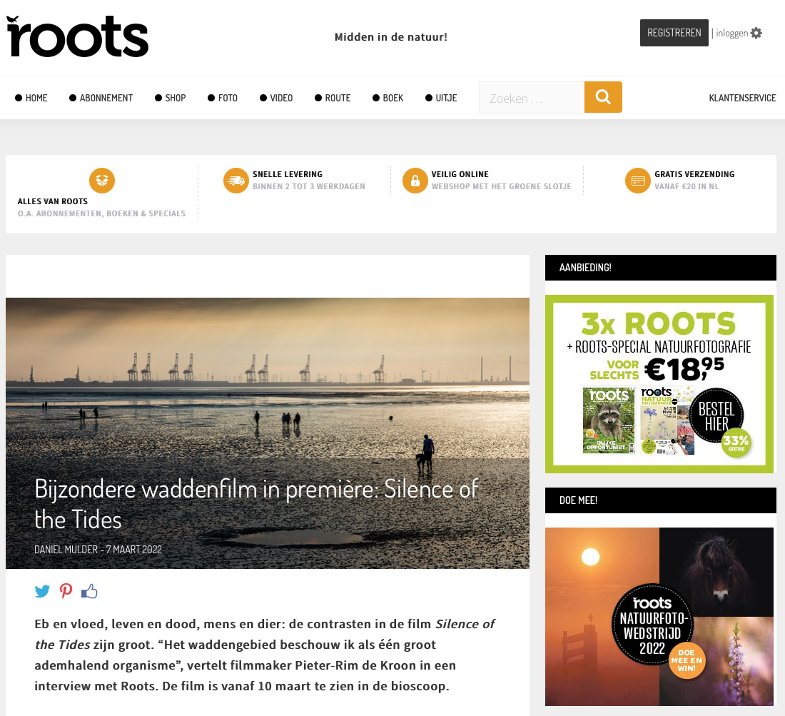 De documentaire Silence of the tides brengt de Waddennatuur en de – soms wringende – relatie met de mens indringend in beeld. Regisseur Pieter-Rim de Kroon en cameraman Dick Harrewijn werkten jaren aan deze film, waarin vogels uiteraard een belangrijke rol spelen.